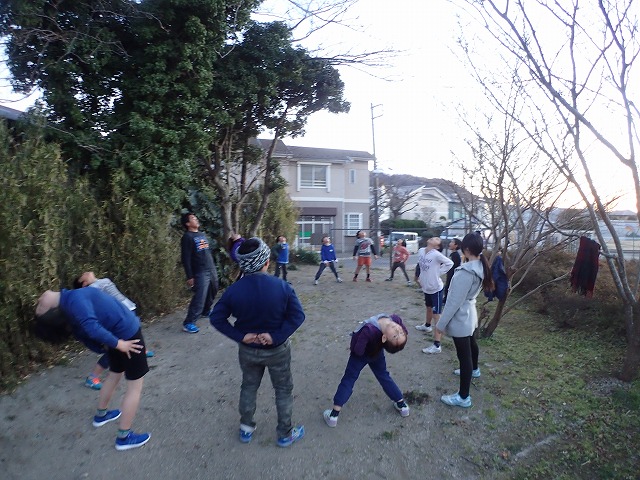 走る前にはストレッチを行い、怪我の予防に努めます。