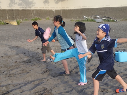 今日は砂浜での活動だったので、基本的な体の運動を行います。