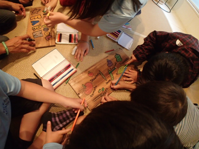 今日のMichael 先生 みんなで畑に行く予定でしたが、開始直前の大雨によりTIDEPOOLにて行う事になりましたね。自然はホントすごいよね~。畑には行けなかったけど、Michael 先生が来てくれたね。最初は久しぶりにあったから名前の確認ですね。その後は、数字の数えかたね。意外と難しかったかな? 畑に行けなかったのですが、TIDEPOOL FARMの看板を作ろうと考えていたMichael先生は板を持って来てくれました。すべてが学びだよね。野菜の名前から、塗った色までも英語ですぐに知ることになります。上の写真では、夏の野菜はなんだろう??ってみんなで考えて答えていますよ。元気よく手を上げていますね~~! そのあとは、みんなの畑に飾る、看板を色付けです。とーってもいい感じにできあがりました!野菜の呼び方も英語で勉強!!!みんなMichael 先生のクラス楽しんでるね!!最後にみんなの自慢の看板!! 楽しみだね!!今村コーチ!!